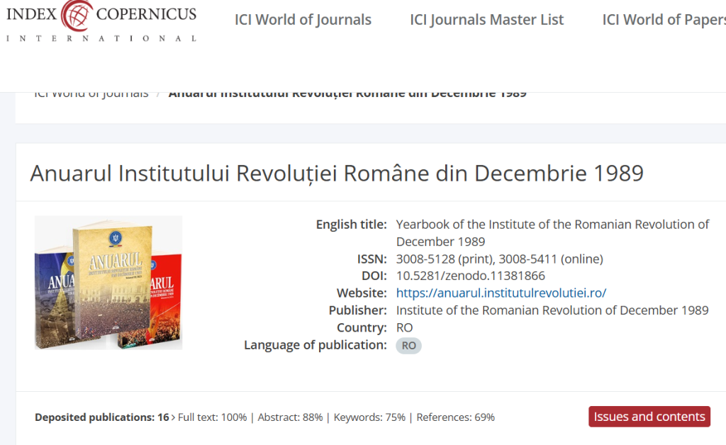 Avem plăcerea să vă informăm că „Anuarul Institutului Revoluției Române din Decembrie 1989”, ISSN: 3008-5128 (print) / 3008-5411 (online), a fost evaluat cu succes de către ICI Journals Master List database, valoarea indicatorului său parametric fiind calculată: ICV 2024 = 49,82. Se impune subliniat faptul că față de evaluarea precedentă (ICV 2023=41,62) s-a constatat o creștere calitativă, fiind recunoscute eforturile constante depuse pentru îndeplinirea standardelor internaționale.