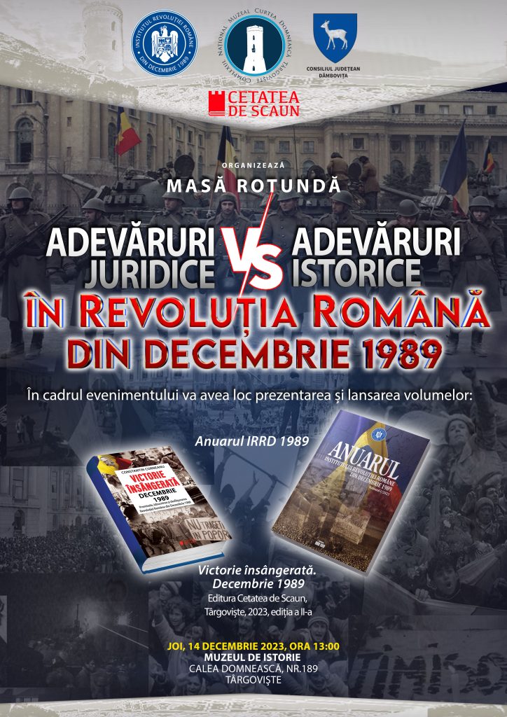 Consiliul Județean Dâmbovița, Institutul Revoluției Române din Decembrie 1989, Complexului Național Muzeal „Curtea Domnească” – Târgoviște și Editura Cetatea de Scaun organizează în data de 14 decembrie 2023, cu începere de la ora 13.00,  Masa Rotundă cu titlul „ Adevăruri juridice versus adevăruri istorice în Revoluția Română din Decembrie 1989”.